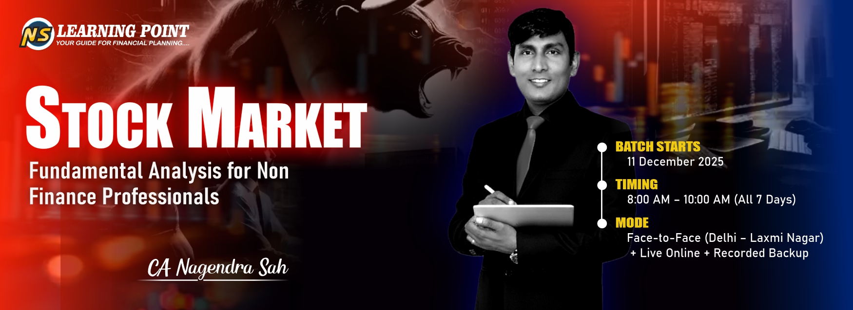 "NS Learning Point/CA Nagendra Sah Sir's Classes I am 101% sure whom student learned from you he/she gets success in his/her life because Sah sir is the best teacher ever his Teaching skills is very good and his explained skills also a very very good compare than other. I know him through his Youtube Channel i.e. CA Nagendra Sah"" this is a very good channel for us who don't have knowledge about the share market. but after saw his videos I found that Sah sir's Class beside my home. I hope one day I will meet you, sir."